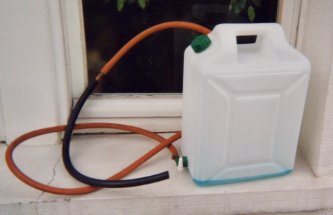 Un bidon style "Jerrycan" alimentaire de 20 ou 30 litres (pas la peine de prendre trop gros, le moteur 'aspire' peu ), avec un robinet sous le dessous.
